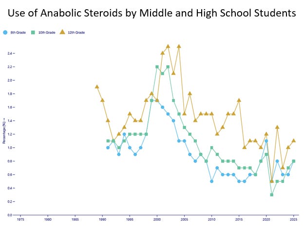 With increasing restrictions on and testing for anabolic steroids, use has fallen in young men since 2000. About 1% of high school seniors now say they are using these drugs.