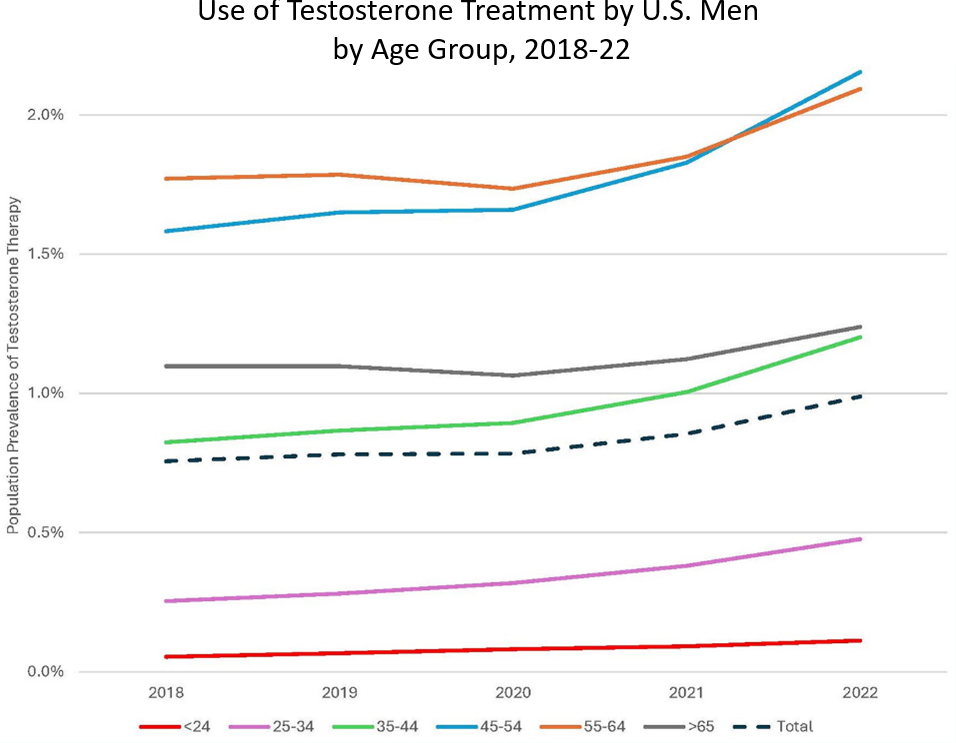 Those ads disappeared and testosterone use stabilized or fell after the FDA warned in 2014 that testosterone may increase the risk of heart disease. But since 2018, use of the hormone by middle-aged men has been rising again. By 2022, in one large study, about 1% of men overall and more than 2% of those age 45-64 were taking testosterone.