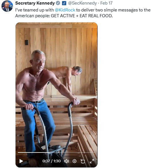 Last week Robert Kennedy, Jr. posted on his official HHS social media account a dystopian video of Kid Rock and himself working out in a sauna, shirtless. In the videos, Kennedy looks unnaturally muscular for a 72-year-old.